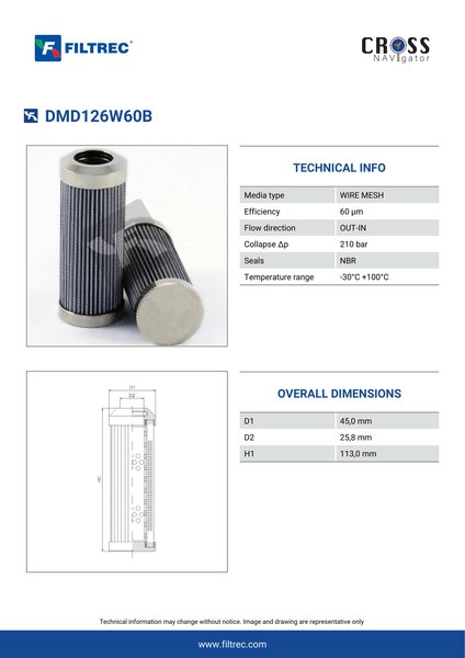 Genuine Filtrec DMD126W60B. This Filtrec element is designed to meet or exceed the quality and performance of brand OEM’s ensuring superior filtration performance and long-lasting durability.