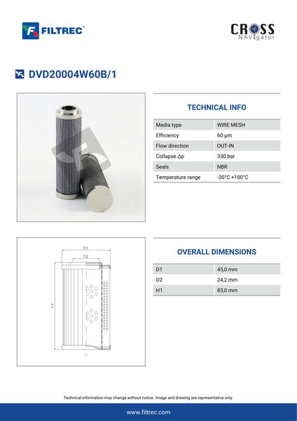 Genuine Filtrec DVD20004W60B/1. This Filtrec element is designed to meet or exceed the quality and performance of brand OEM’s ensuring superior filtration performance and long-lasting durability.Engineered with their high performance media and a durable design, the DVD20004W60B/1 provides reliable and consistent performance over its lifespan, even in harsh operating environments. When you order from FilterFinder, you can trust that you are getting a reliable and high-quality replacement filter that will keep your system running smoothly.