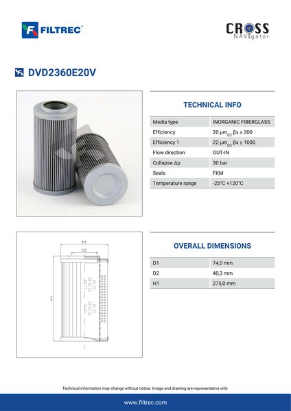 The efficiency of the element is shown using the Micron (µ) and Beta (β) ratings. The micron rating indicates the size of the particle being filtered and the beta rating the efficiency, calculated as 1/β.
