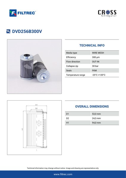 Genuine Filtrec DVD256B300V. This Filtrec element is designed to meet or exceed the quality and performance of brand OEM’s ensuring superior filtration performance and long-lasting durability.