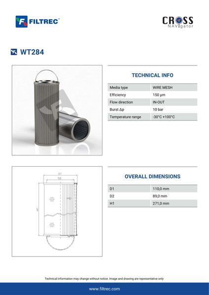 Genuine Filtrec WT284. This Filtrec element is designed to meet or exceed the quality and performance of brand OEM’s ensuring superior filtration performance and long-lasting durability.