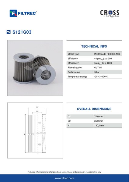 Genuine Filtrec S121G03. This Filtrec element is designed to meet or exceed the quality and performance of brand OEM’s ensuring superior filtration performance and long-lasting durability.