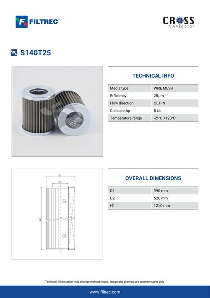 Genuine Filtrec S140T25. This Filtrec element is designed to meet or exceed the quality and performance of brand OEM’s ensuring superior filtration performance and long-lasting durability.