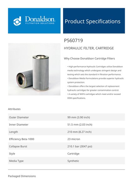 Genuine Donaldson P560719 Hydraulic Filter, Cartridge is designed to provide superior protection for your hydraulic system, effectively capturing contaminants to ensure clean fluid circulation. With high-quality filtration media, it extends equipment life, improves operational efficiency, and maintains fluid cleanliness even in the most demanding environments.
