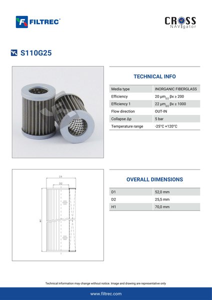 Genuine Filtrec S110G25. This Filtrec element is designed to meet or exceed the quality and performance of brand OEM’s ensuring superior filtration performance and long-lasting durability.