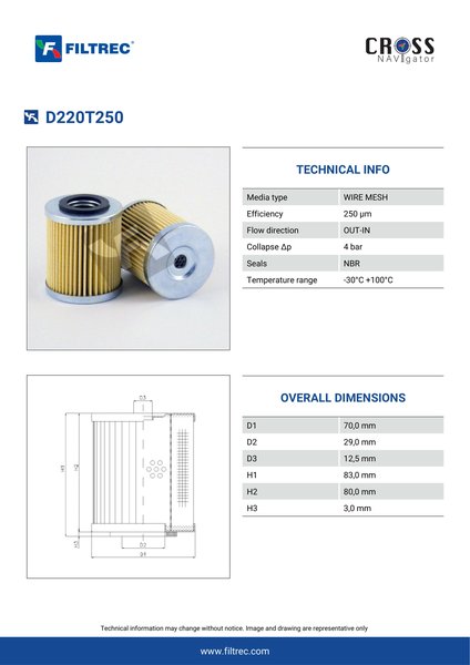 Genuine Filtrec D220T250. This Filtrec element is designed to meet or exceed the quality and performance of brand OEM’s ensuring superior filtration performance and long-lasting durability.