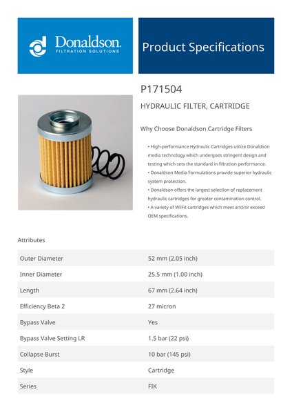 Genuine Donaldson P171504 Hydraulic Filter, Cartridge is designed to provide superior protection for your hydraulic system, effectively capturing contaminants to ensure clean fluid circulation. With high-quality filtration media, it extends equipment life, improves operational efficiency, and maintains fluid cleanliness even in the most demanding environments.