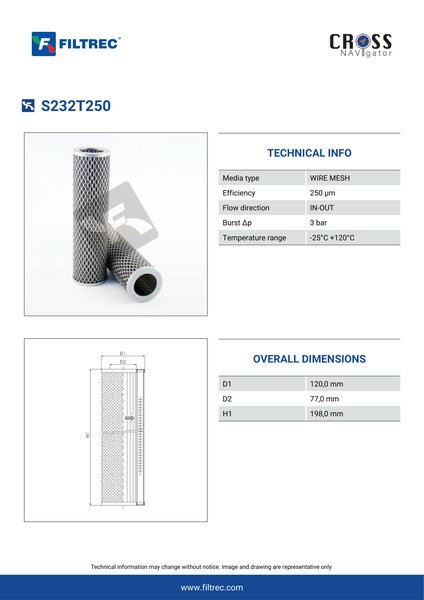 Genuine Filtrec S232T250. This Filtrec element is designed to meet or exceed the quality and performance of brand OEM’s ensuring superior filtration performance and long-lasting durability.