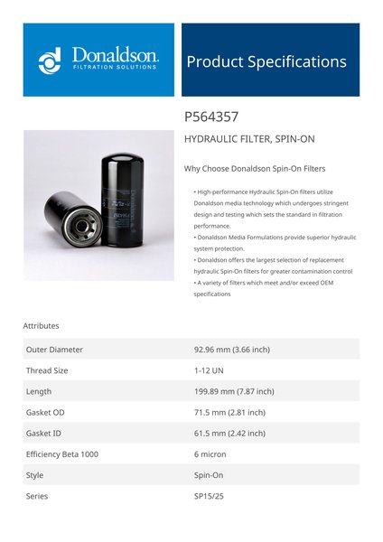 Genuine Donaldson P564357 Hydraulic Filter, Spin-On provides dependable protection for hydraulic systems by efficiently removing particulates and contaminants. It ensures clean hydraulic fluid, promoting smooth operation and extending the lifespan of critical system components.