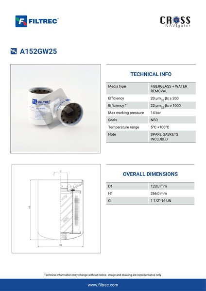 Genuine Filtrec A152GW25. This Filtrec element is designed to meet or exceed the quality and performance of brand OEM’s ensuring superior filtration performance and long-lasting durability.