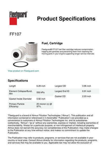 Fleetguard® FF107 fuel filter cartridge reduces contamination, trapping dirt particles and preventing them from reaching the moving parts in your engine supporting longer service intervals.Specification