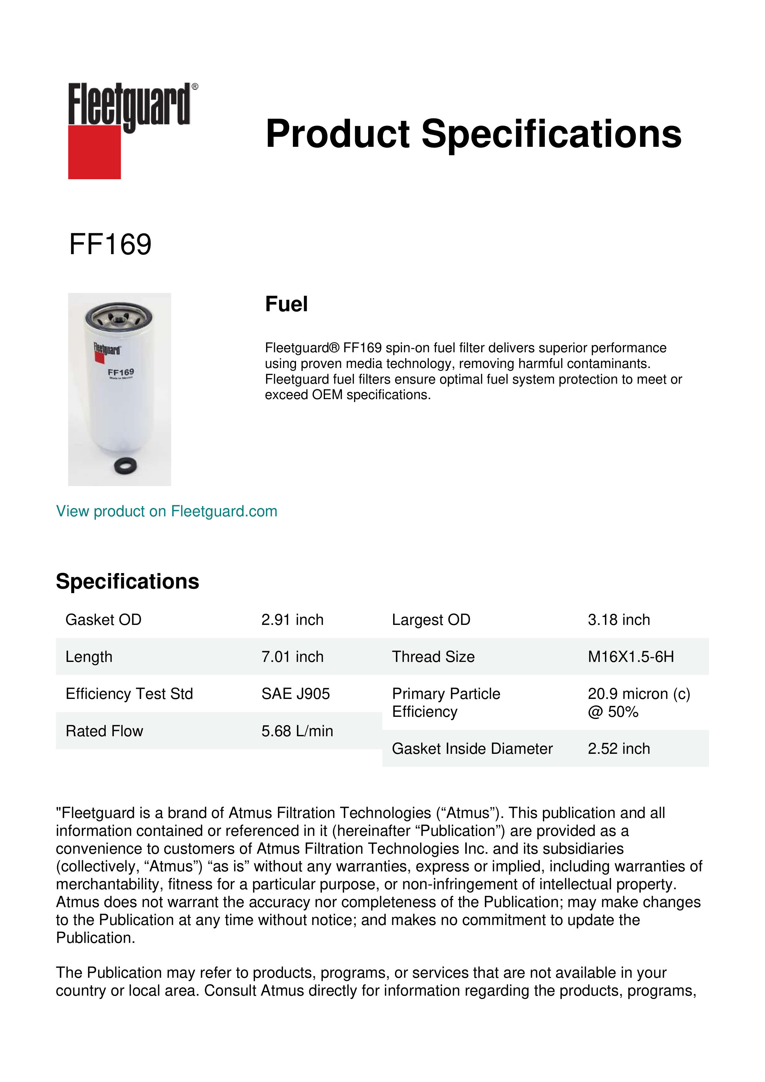 Fleetguard® FF169 spin-on fuel filter delivers superior performance using proven media technology, removing harmful contaminants. Fleetguard fuel filters ensure optimal fuel system protection to meet or exceed OEM specifications.Specification