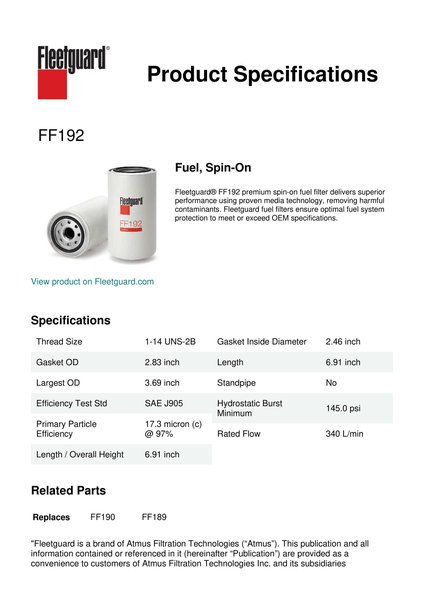 Fleetguard® FF192 premium spin-on fuel filter delivers superior performance using proven media technology, removing harmful contaminants. Fleetguard fuel filters ensure optimal fuel system protection to meet or exceed OEM specifications.Specification