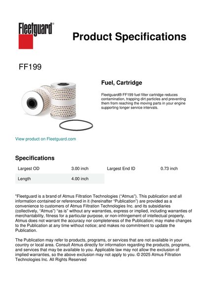 Fleetguard® FF199 fuel filter cartridge reduces contamination, trapping dirt particles and preventing them from reaching the moving parts in your engine supporting longer service intervals.Specification