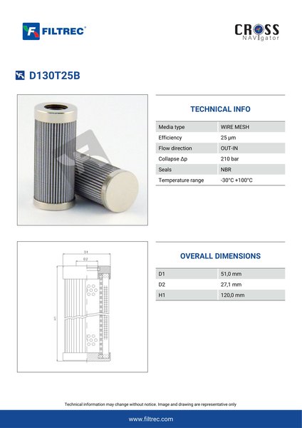 Genuine Filtrec D130T25B. This Filtrec element is designed to meet or exceed the quality and performance of brand OEM’s ensuring superior filtration performance and long-lasting durability.