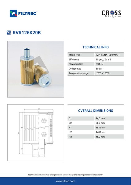 Engineered with their high performance media and a durable design, the RVR125K20B provides reliable and consistent performance over its lifespan, even in harsh operating environments. When you order from FilterFinder, you can trust that you are getting a reliable and high-quality replacement filter that will keep your system running smoothly.