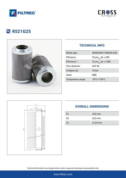 The efficiency of the element is shown using the Micron (µ) and Beta (β) ratings. The micron rating indicates the size of the particle being filtered and the beta rating the efficiency, calculated as 1/β.
