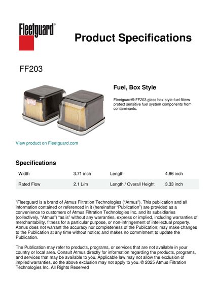 Fleetguard® FF203 glass box-style fuel filters protect sensitive fuel system components from contaminants.Specification