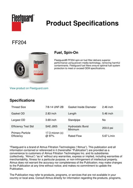 Fleetguard® FF204 spin-on fuel filter delivers superior performance using proven media technology, removing harmful contaminants. Fleetguard fuel filters ensure optimal fuel system protection to meet or exceed OEM specifications.Specification