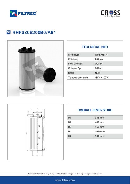 Filtrec RHR330S200B0/AB1 Replaces the FilterFinder FF204941B