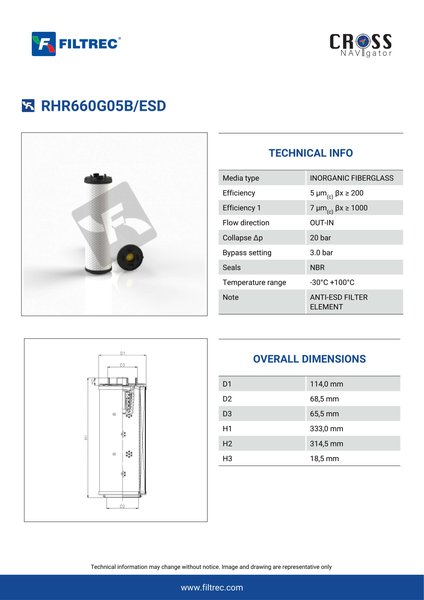 The efficiency of the element is shown using the Micron (µ) and Beta (β) ratings. The micron rating indicates the size of the particle being filtered and the beta rating the efficiency, calculated as 1/β.