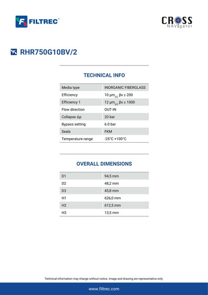Genuine Filtrec RHR750G10BV/2. This Filtrec element is designed to meet or exceed the quality and performance of brand OEM’s ensuring superior filtration performance and long-lasting durability.Engineered with their high performance media and a durable design, the RHR750G10BV/2 provides reliable and consistent performance over its lifespan, even in harsh operating environments. When you order from FilterFinder, you can trust that you are getting a reliable and high-quality replacement filter that will keep your system running smoothly.