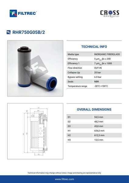 Genuine Filtrec RHR750G05B/2. This Filtrec element is designed to meet or exceed the quality and performance of brand OEM’s ensuring superior filtration performance and long-lasting durability.