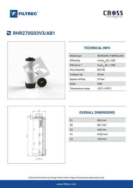 Engineered with their high performance media and a durable design, the RHR270G03V3/AB1 provides reliable and consistent performance over its lifespan, even in harsh operating environments. When you order from FilterFinder, you can trust that you are getting a reliable and high-quality replacement filter that will keep your system running smoothly.