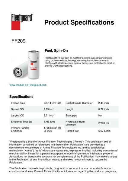 Fleetguard® FF209 spin-on fuel filter delivers superior performance using proven media technology, removing harmful contaminants. Fleetguard fuel filters ensure optimal fuel system protection to meet or exceed OEM specifications.Specification