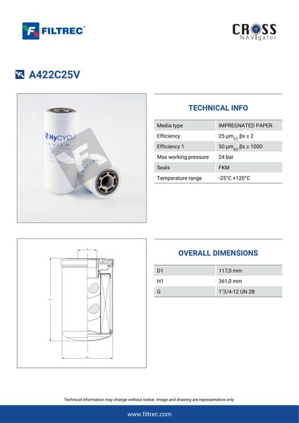 Engineered with their high performance media and a durable design, the A422C25V provides reliable and consistent performance over its lifespan, even in harsh operating environments. When you order from FilterFinder, you can trust that you are getting a reliable and high-quality replacement filter that will keep your system running smoothly.