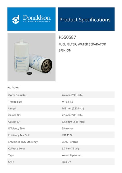 Genuine Donaldson P550587 Fuel Filter, Water Separator Spin-On is designed to remove contaminants and separate water from diesel fuel, safeguarding your engine against corrosion and injector damage. It ensures clean fuel delivery, enhancing engine efficiency and supporting reliable performance in diesel applications.