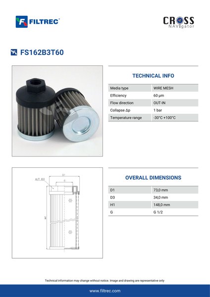 Filtrec FS162B3T60 Replaces the FilterFinder FF216687B