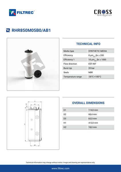 Genuine Filtrec RHR850M05B0/AB1. This Filtrec element is designed to meet or exceed the quality and performance of brand OEM’s ensuring superior filtration performance and long-lasting durability.Engineered with their high performance media and a durable design, the RHR850M05B0/AB1 provides reliable and consistent performance over its lifespan, even in harsh operating environments. When you order from FilterFinder, you can trust that you are getting a reliable and high-quality replacement filter that will keep your system running smoothly.