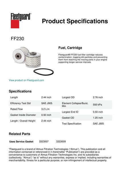 Fleetguard® FF230 fuel filter cartridge reduces contamination, trapping dirt particles and preventing them from reaching the moving parts in your engine supporting longer service intervals.Specification