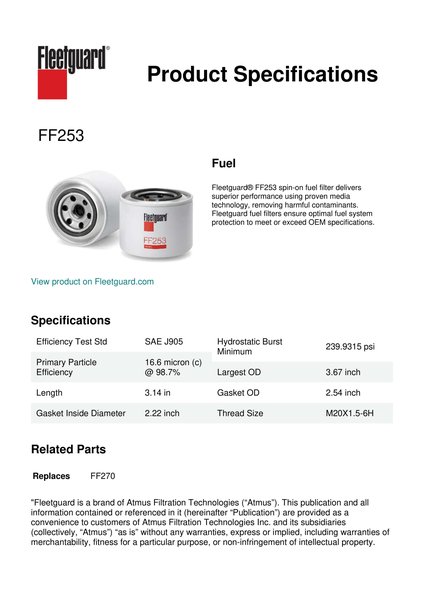Fleetguard® FF253 spin-on fuel filter delivers superior performance using proven media technology, removing harmful contaminants. Fleetguard fuel filters ensure optimal fuel system protection to meet or exceed OEM specifications.Specification