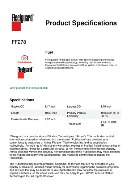 Fleetguard® FF278 spin-on fuel filter delivers superior performance using proven media technology, removing harmful contaminants. Fleetguard fuel filters ensure optimal fuel system protection to meet or exceed OEM specifications.Specification
