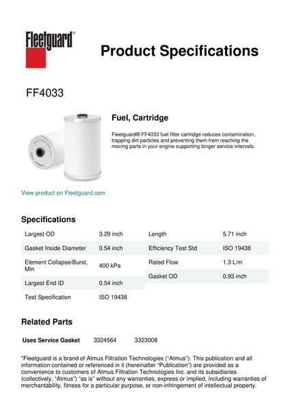 Fleetguard® FF4033 fuel filter cartridge reduces contamination, trapping dirt particles and preventing them from reaching the moving parts in your engine supporting longer service intervals.Specification