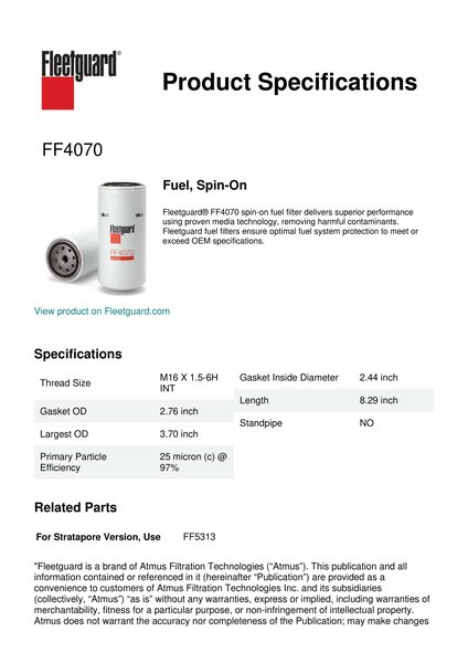 Fleetguard® FF4070 spin-on fuel filter delivers superior performance using proven media technology, removing harmful contaminants. Fleetguard fuel filters ensure optimal fuel system protection to meet or exceed OEM specifications.Specification