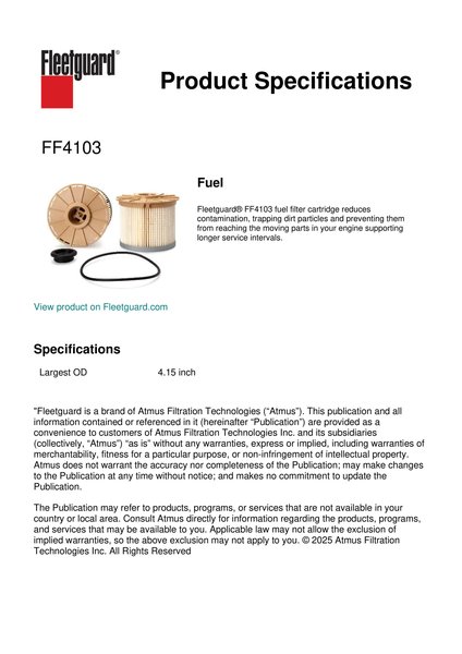 Fleetguard® FF4103 fuel filter cartridge reduces contamination, trapping dirt particles and preventing them from reaching the moving parts in your engine supporting longer service intervals.Specification