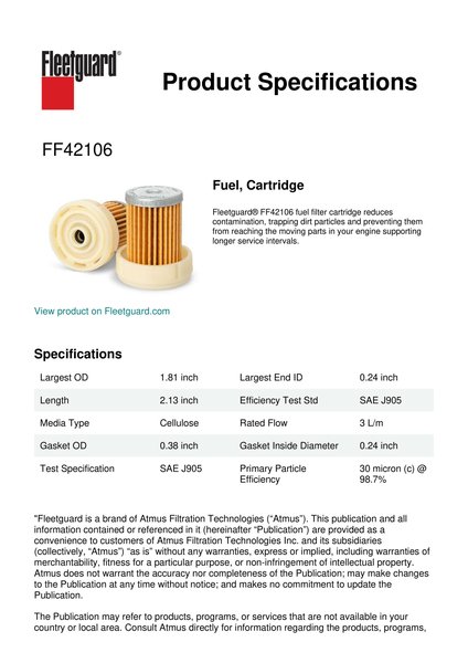 Fleetguard® FF42106 fuel filter cartridge reduces contamination, trapping dirt particles and preventing them from reaching the moving parts in your engine supporting longer service intervals.Specification
