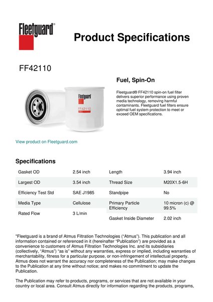 Fleetguard® FF42110 spin-on fuel filter delivers superior performance using proven media technology, removing harmful contaminants. Fleetguard fuel filters ensure optimal fuel system protection to meet or exceed OEM specifications.Specification