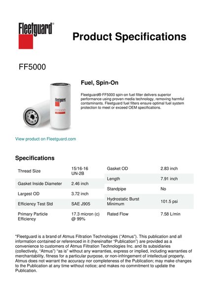 Fleetguard® FF5000 spin-on fuel filter delivers superior performance using proven media technology, removing harmful contaminants. Fleetguard fuel filters ensure optimal fuel system protection to meet or exceed OEM specifications.Specification