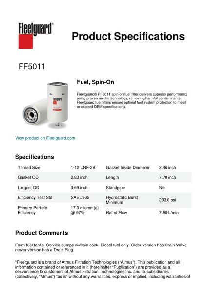 Fleetguard® FF5011 spin-on fuel filter delivers superior performance using proven media technology, removing harmful contaminants. Fleetguard fuel filters ensure optimal fuel system protection to meet or exceed OEM specifications.Specification