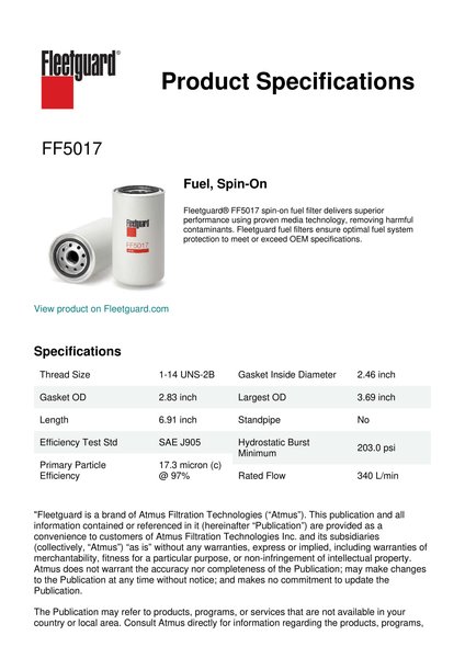 Fleetguard® FF5017 spin-on fuel filter delivers superior performance using proven media technology, removing harmful contaminants. Fleetguard fuel filters ensure optimal fuel system protection to meet or exceed OEM specifications.Specification