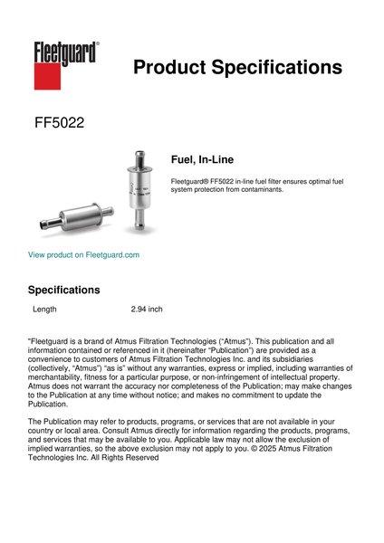 Fleetguard® FF5022 in-line fuel filter ensures optimal fuel system protection from contaminants.Specification