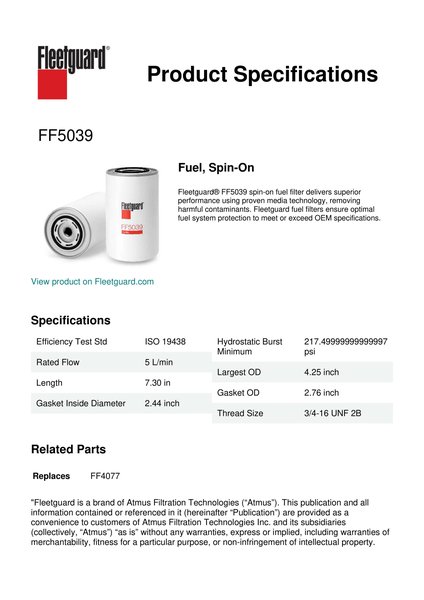 Fleetguard® FF5039 spin-on fuel filter delivers superior performance using proven media technology, removing harmful contaminants. Fleetguard fuel filters ensure optimal fuel system protection to meet or exceed OEM specifications.Specification