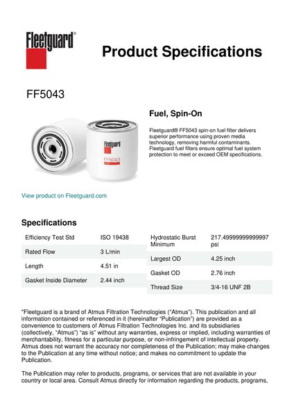 Fleetguard® FF5043 spin-on fuel filter delivers superior performance using proven media technology, removing harmful contaminants. Fleetguard fuel filters ensure optimal fuel system protection to meet or exceed OEM specifications.Specification