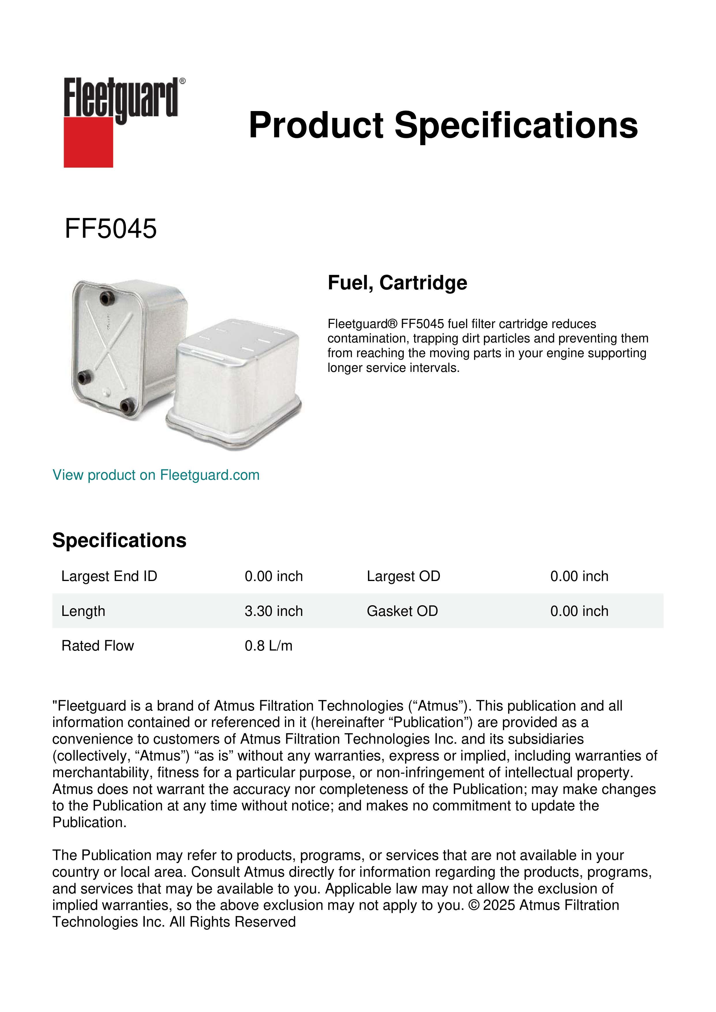 Fleetguard® FF5045 fuel filter cartridge reduces contamination, trapping dirt particles and preventing them from reaching the moving parts in your engine supporting longer service intervals.Specification