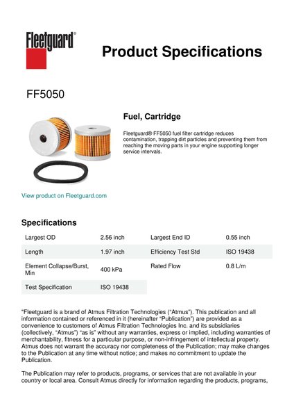 Fleetguard® FF5050 fuel filter cartridge reduces contamination, trapping dirt particles and preventing them from reaching the moving parts in your engine supporting longer service intervals.Specification