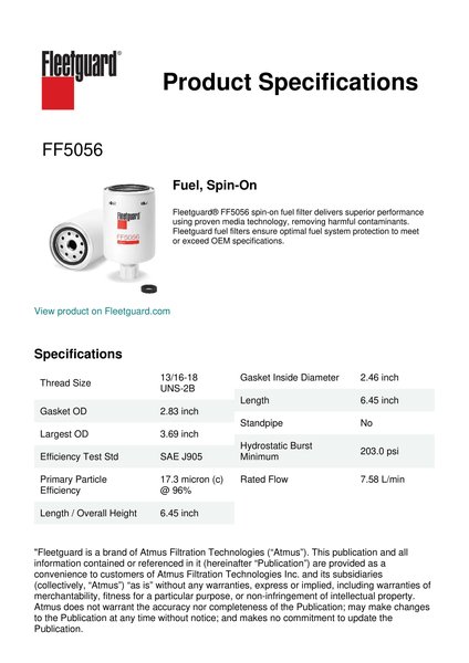 Fleetguard® FF5056 spin-on fuel filter delivers superior performance using proven media technology, removing harmful contaminants. Fleetguard fuel filters ensure optimal fuel system protection to meet or exceed OEM specifications.Specification
